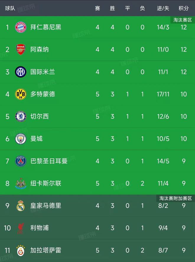 欧冠第5轮率先结束了9场比赛,最新积分榜如下!